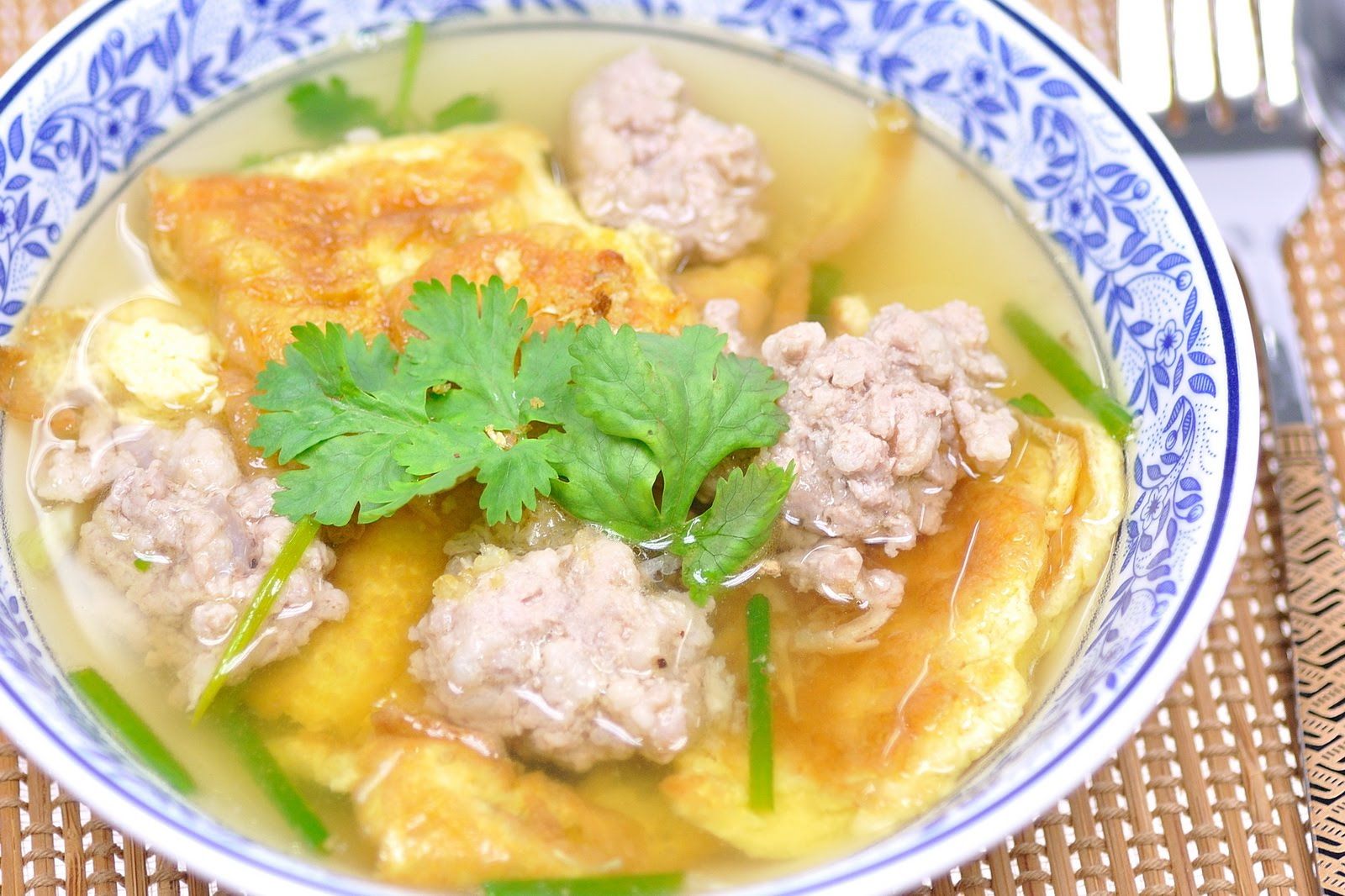 - เติมน้ำเปล่าลงไปในกระทะใบเดิม ใส่รากผักชี กระเทียม พริกไทยเม็ด พอเดือดปั้นหมูสับที่หมักไว้เป็นก้อนกลมลงต้มพอสุก ใส่เกลือป่น คอยช้อนฟองออก