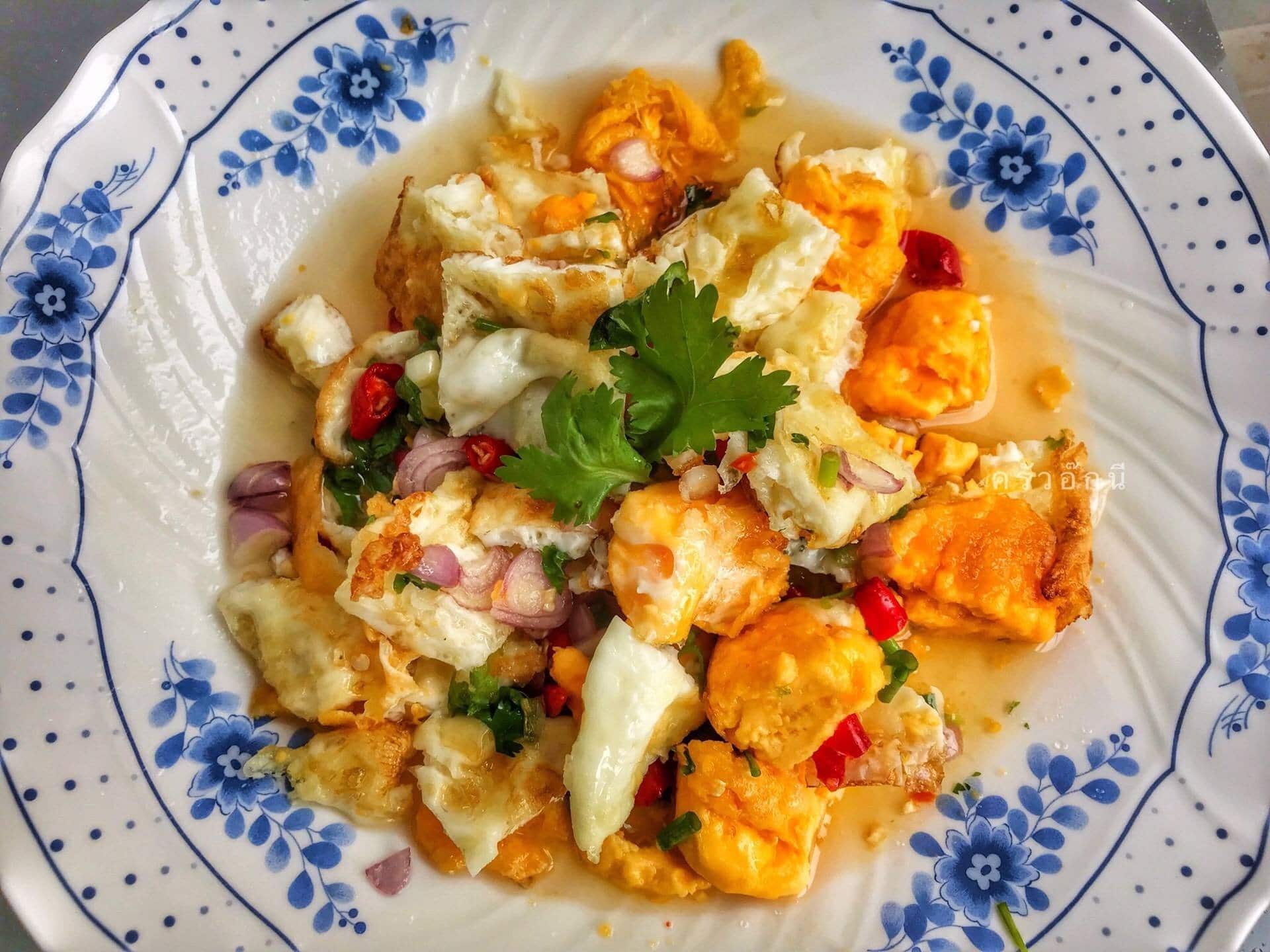 - นำไข่ดาวมาหั่นพอดีคำ เทน้ำยำลงไป คลุกให้เข้ากันพร้อมจัดเสิร์ฟ