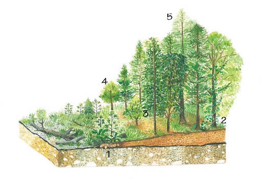 ระดับที่ 5 ประเภทต้นไม้ใหญ่ทรงสูงให้ร่มเงา และช่วยรักษาระบบนิเวศ เช่น ตะเคียน ยางนา มะค่า ประดู่ สัก พะยูง มะฮอกกานี จำปาทอง