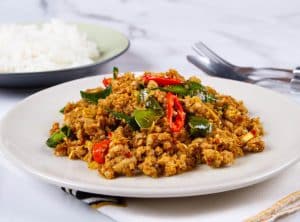 - นำหมูสับที่เตรียมไว้ใส่ตามลงไป ผัดหมูสับ และพริกแกงให้เข้ากัน ค่อย ๆ เติมน้ำเปล่าลงไปเล็กน้อยคนให้เข้ากันจนหมูเริ่มสุก