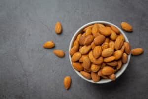 อัลมอนด์ เป็นถั่วเปลือกแข็งที่มีโปรตีนสูง อุดมไปด้วยสารอาหารที่จำเป็น อย่างโฟเลต แมงกานีส และแมกนีเซียม อีกทั้งยังมีกรดไขมันที่จำเป็นต่อร่างกาย เช่น วิตามิน B วิตามิน E ใยอาหาร และกรดไขมันโอเมก้า 3 นอกจากนี้อัลมอนด์ ยังเป็นอาหารว่างเพื่อสุขภาพที่ดีต่อระบบเผาผลาญ ช่วยลดความอยากอาหาร และทำให้รู้สึกอิ่มนาน ซึ่งปริมาณอัลมอนด์ 100 กรัม จะให้ปริมาณโปรตีนประมาณ 22 กรัม
