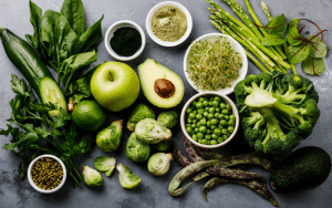 สีเขียวในผัก และผลไม้มาจากเม็ดสีของสารที่มีชื่อว่า คลอโรฟิลด์ (Chlorophyll) ซึ่งเต็มไปด้วยสารต้านอนุมูลอิสระ ช่วยในการต่อต้านโรคมะเร็ง ทำให้ผิวพรรณเปล่งปลั่งสดใส ช่วยยับยั้งการเกิดริ้วรอย นอกจากนี้การทานผักใบเขียวเป็นประจำจะช่วยให้การขับถ่ายดี ลดอากาท้องผูก เนื่องจากผักเหล่านี้มีกากใยสูงมีส่วนช่วยในการลดน้ำหนัก เนื่องจากให้พลังงานต่ำ โดยผักผลไม้ในกลุ่มนี้ ได้แก่ ผักบุ้ง กะหล่ำปลี กวางตุ้ง ผักคะน้า ผักโขม บล็อกโคลี่ ฝรั่ง พุทรา น้อยหน่า มะกอกน้ำ อะโวคาโด แอปเปิ้ลเขียว ฯลฯ