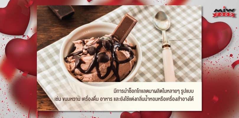 ปัจจุบันช็อกโกแลตถูกผลิตออกมาในหลายๆ รูปแบบเช่น ขนมหวาน เครื่องดื่ม หรือแม้กระทั่งเป็นส่วนประกอบของอาหาร และยังนำมาใช้แต่งกลิ่นน้ำหอมหรือเครื่องสำอางได้อีกด้วย