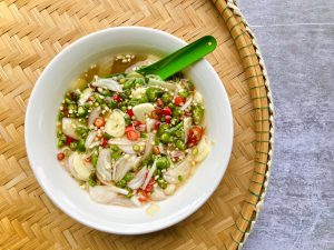 2. ใส่ผักชีซอย น้ำตาลปี๊บ น้ำปลา น้ำมะนาว คนให้น้ำตาลปี๊บละลาย และเข้ากันดี ก็พร้อมจัดเสิร์ฟ