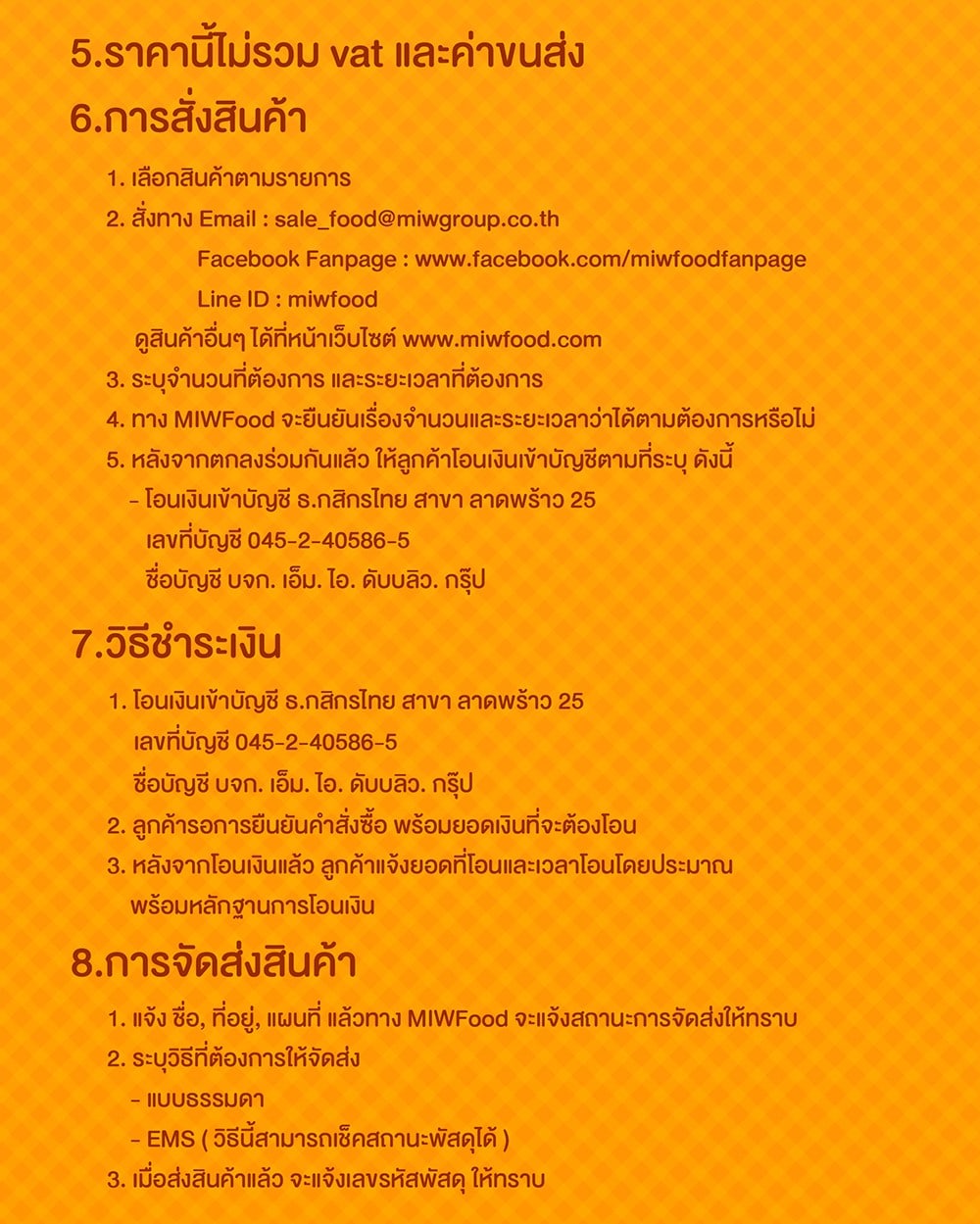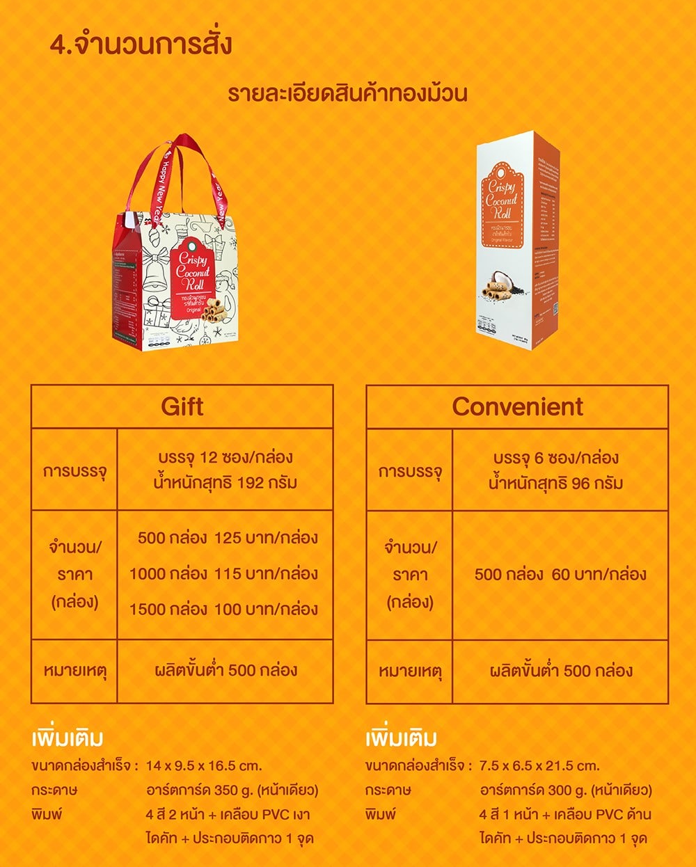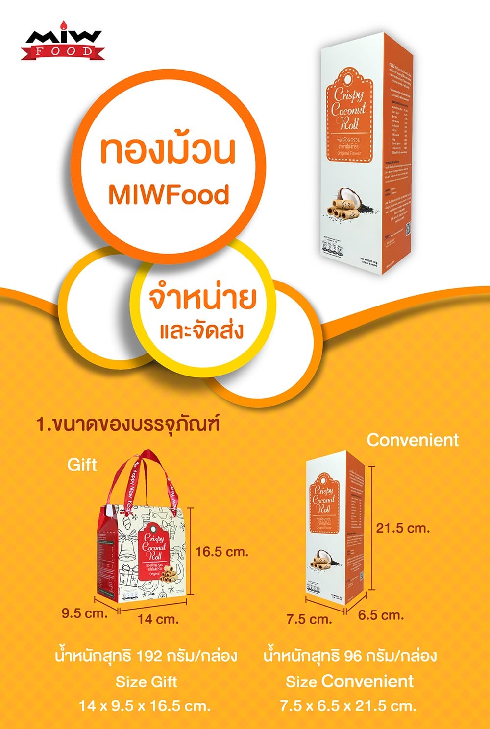 วิธีการสั่งซื้อทองม้วนแบบ OEM พร้อมแพ็กเกจ โดยตัวแพ็กเกจจะเป็นแบบสำเร็จที่ทาง M.I.W. Food ออกแบบไว้เรียบร้อยแล้ว ลูกค้าสามารถเลือกขนาดและจำนวนที่ต้องการและสั่งซื้อได้เลยลูกค้าสามารถเลือกขนาดของกล่องบรรจุภัณฑ์ได้ อาทิ Gift ขนาดกล่อง 14×9.5×16.5 ซม. น้ำหนักสุทธิ 192 กรัม/กล่อง หรือ Convenient ขนาดกล่อง 7.5×6.5×21.5 ซม. น้ำหนักสุทธิ 96 กรัม
