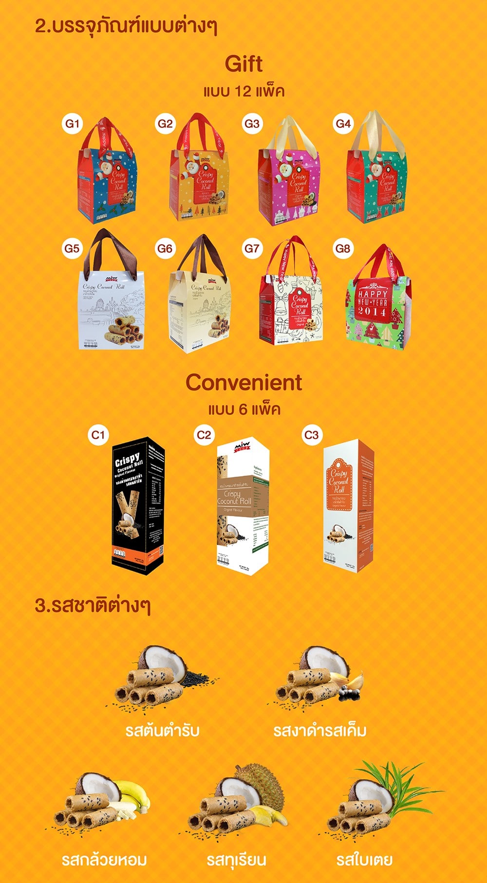 - ทองม้วนกรอบ รสต้น รสชาติกลมกล่อม หอมละมุนด้วยกะทิสด และน้ำตาล ไข่ ส่วนผสมที่ทำให้มีรสชาติที่เป็นเอกลักษณ์แบบไทยไทย