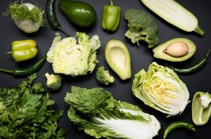 ผักใบเขียว เช่น คะน้า ผักโขม ผักปวยเล้ง บรอกโคลี กะหล่ำดอก หรือกระเจี๊ยบ อุดมไปด้วยใยอาหาร วิตามินเอ วิตามินซี และสารต้านอนุมูลอิสระ ใยอาหารช่วยกระตุ้นการทำงานของลำไส้ ลดอาการท้องผูก ส่วนวิตามินช่วยบำรุงผิว ลดการอักเสบ และทำให้ผิวดูแข็งแรงขึ้นเมื่อรับประทานเป็นประจำ